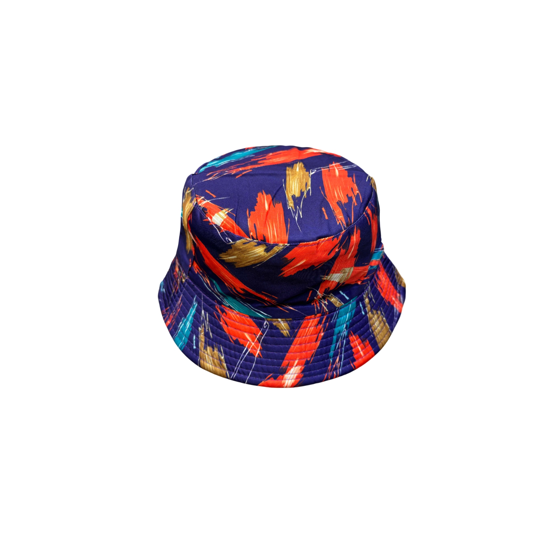 这顶渔夫帽饰有醒目的抽象笔触图案。它采用100%涤纶制成,采用均码设计,适合大多数人佩戴。帽子以深蓝色为底色,点缀着鲜艳的红色、金色和青色,营造出大胆而富有艺术感的外观。渔夫帽的造型既能防晒,又兼具休闲时尚的美感,非常适合日常穿着或户外活动时展现时尚风范。