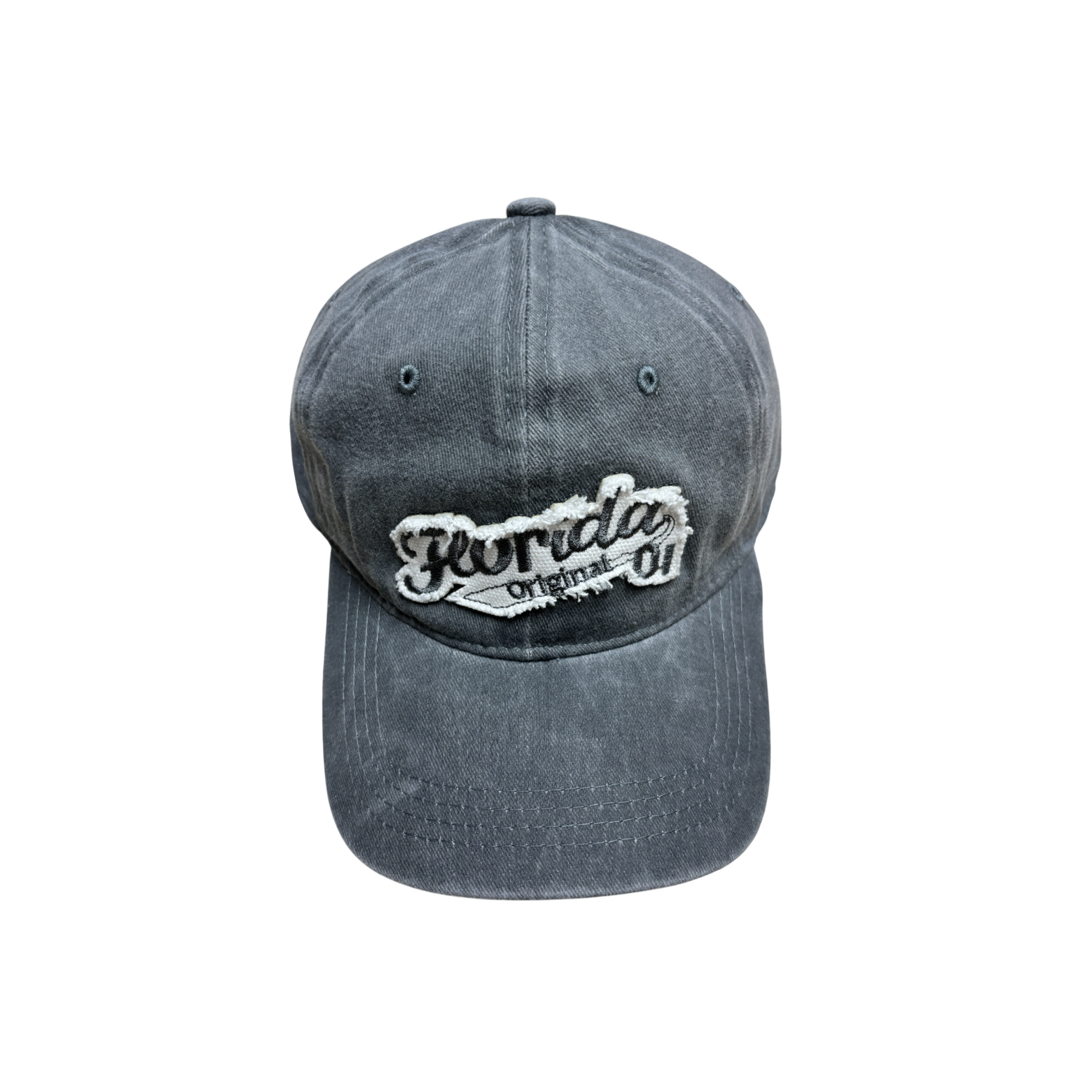 This is a baseball cap with a one - size - fits - most design, made of 100% cotton. It has a classic baseball cap shape and is treated with a washing process, showing a retro - styled, dark gray appearance. The front features a distressed - edge embroidered patch with “Florida Original 01” lettering. It has an American retro and street - trendy vibe. The cotton fabric is comfortable and skin - friendly, suitable for daily casual wear, outdoor activities and other scenarios.