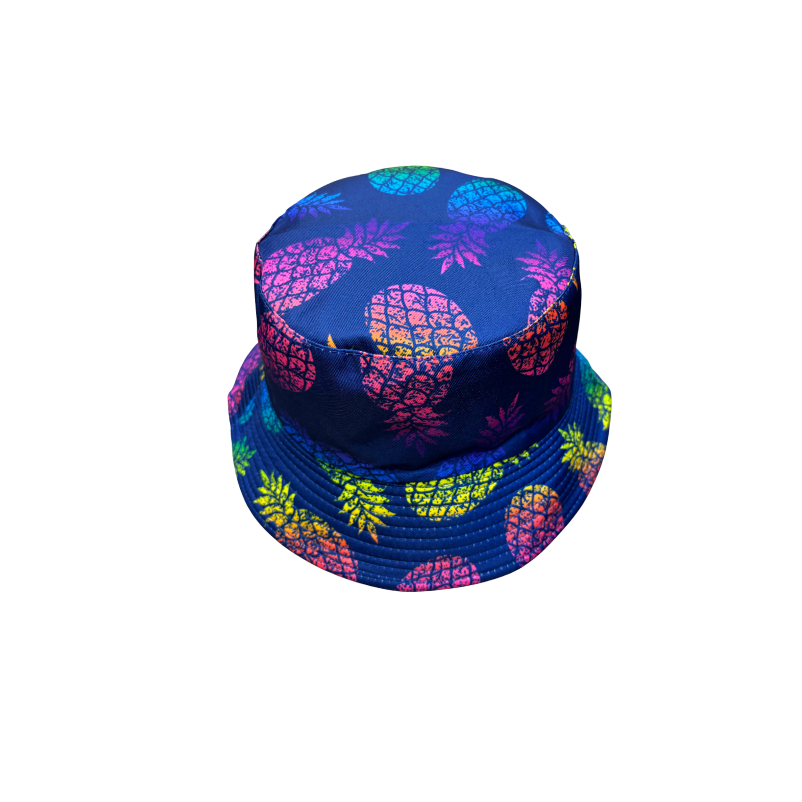 This is a bucket hat with a vibrant pineapple pattern. Made from 100% polyester, it’s designed as one - size - fits - most. The hat features a blue base color adorned with colorful, gradient - colored pineapples, creating a fun and tropical look. Its bucket shape offers sun protection and a casual, trendy vibe, perfect for adding a touch of summer flair to your outfits.