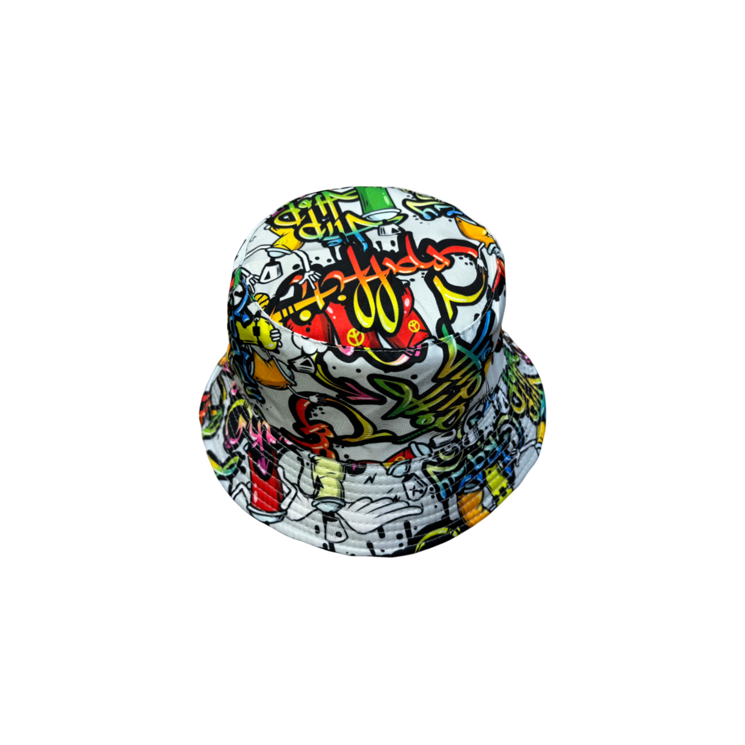 This is a bucket hat with a vibrant graffiti - style print. Crafted from 100% polyester, it’s designed as one - size - fits - most. The hat features a white base color adorned with a variety of colorful, intricate graffiti patterns, including letters, symbols, and illustrations, creating an edgy and artistic streetwear look. Its bucket shape offers sun protection and a casual, trendy aesthetic, perfect for making a bold fashion statement.