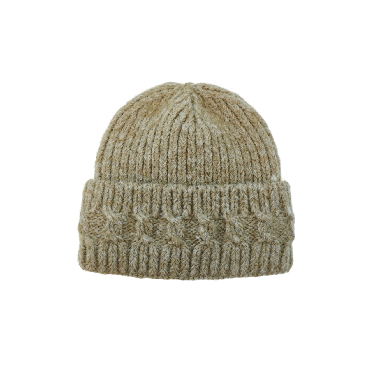 This is a one - size - fits - most knitted hat made of acrylic. It has a classic cuffed beanie shape, mainly in light khaki. A cable - knit technique is used on the cuffed part to create a unique texture, adding details. The overall style is simple and rustic. The acrylic material provides good warmth retention, suitable for daily autumn - winter wear, creating a warm and casual atmosphere for the outfit.