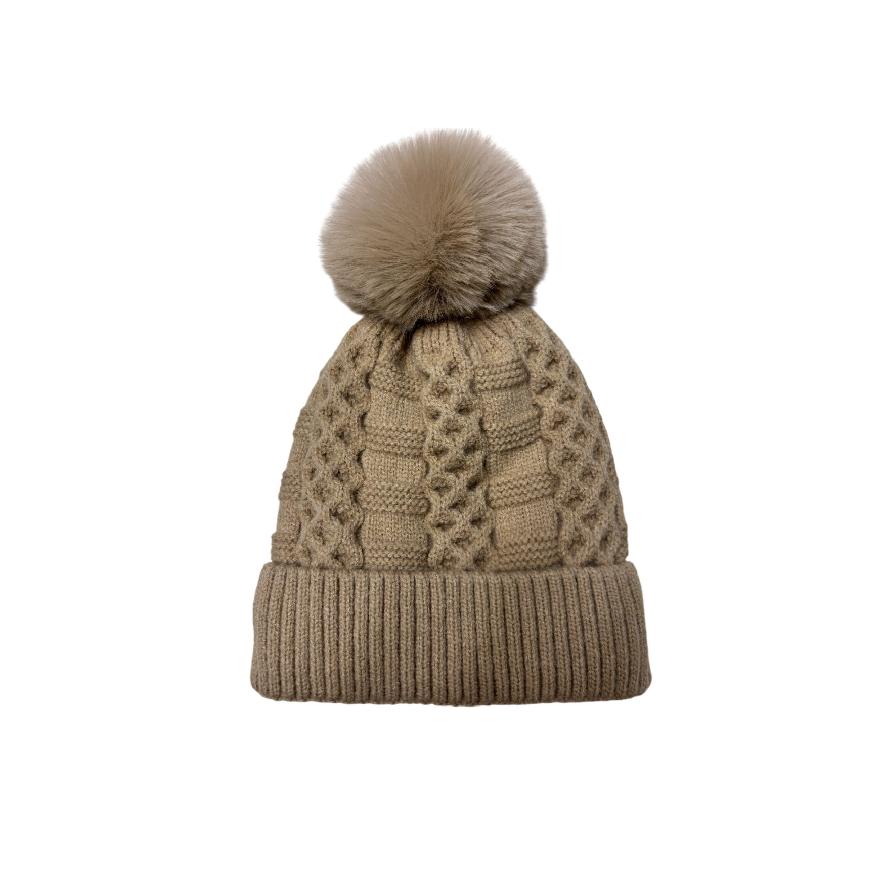 This is a one - size - fits - most knitted hat made of acrylic. It has a classic cuffed beanie shape. The main body is in a soft khaki tone, and the hat body uses a cable - knit technique to present a three - dimensional checkered texture, with rich layers. A matching - color fluffy pom - pom on the top adds a playful and warm touch. The acrylic material provides good warmth, suitable for daily autumn - winter wear, infusing a simple yet exquisite atmosphere into the outfit, and easily creating a casual and fashionable style.