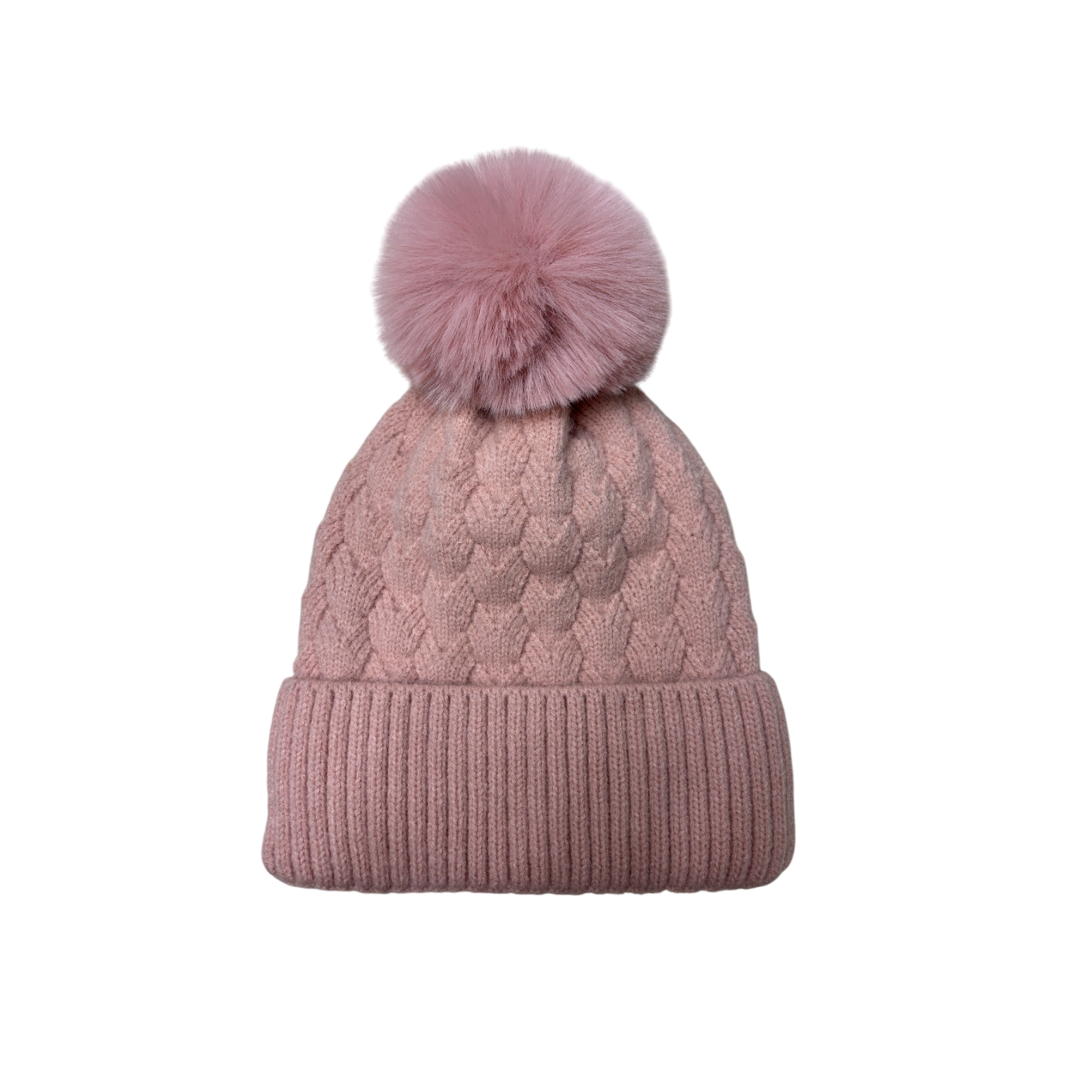 This is a one - size - fits - most knitted hat made of acrylic. It has a classic cuffed beanie shape. The main body is in a soft pink color, with a three - dimensional texture presented by the cable - knit technique, and the texture is delicate. A matching - color fluffy pom - pom on the top adds a sweet and playful touch. The acrylic material provides good warmth, suitable for daily autumn - winter wear, infusing a gentle and romantic atmosphere into the outfit, and easily creating a sweet - style look.