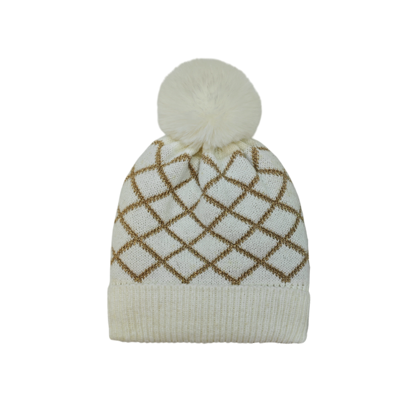 This is a one - size - fits - most knitted hat made of acrylic. It has a classic beanie shape, with an off - white base color and golden diamond - shaped jacquard patterns, simple yet elegant. A matching - color fluffy pom - pom adorns the top, adding a sweet vibe. The acrylic material provides good warmth, suitable for autumn - winter, infusing an elegant style into the outfit.