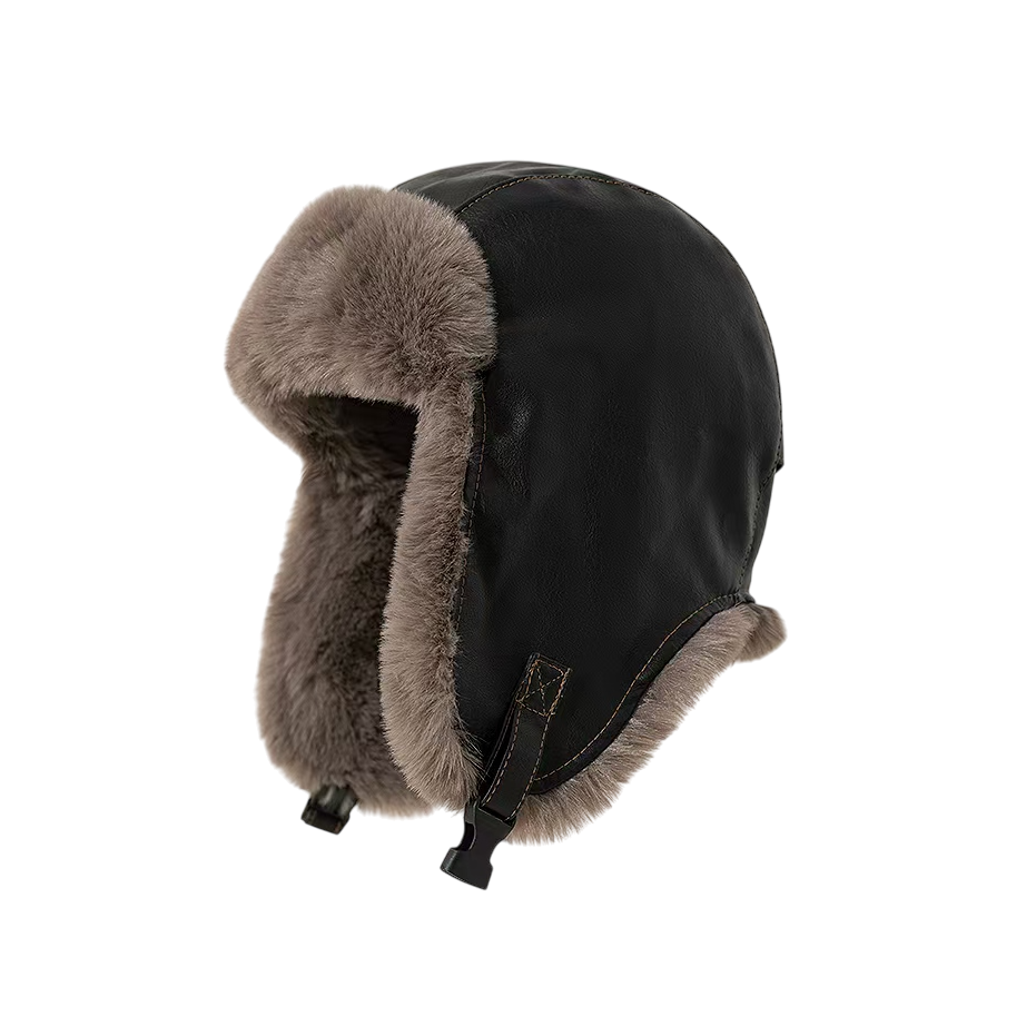 This one - size - fits - all fashionable hat is black, with a leather - like appearance and light brown plush lining for good warmth retention. The overall design is simple and elegant. The earflap style can resist the cold well, suitable for wearing in cold weather, adding warmth and texture to the outfit.