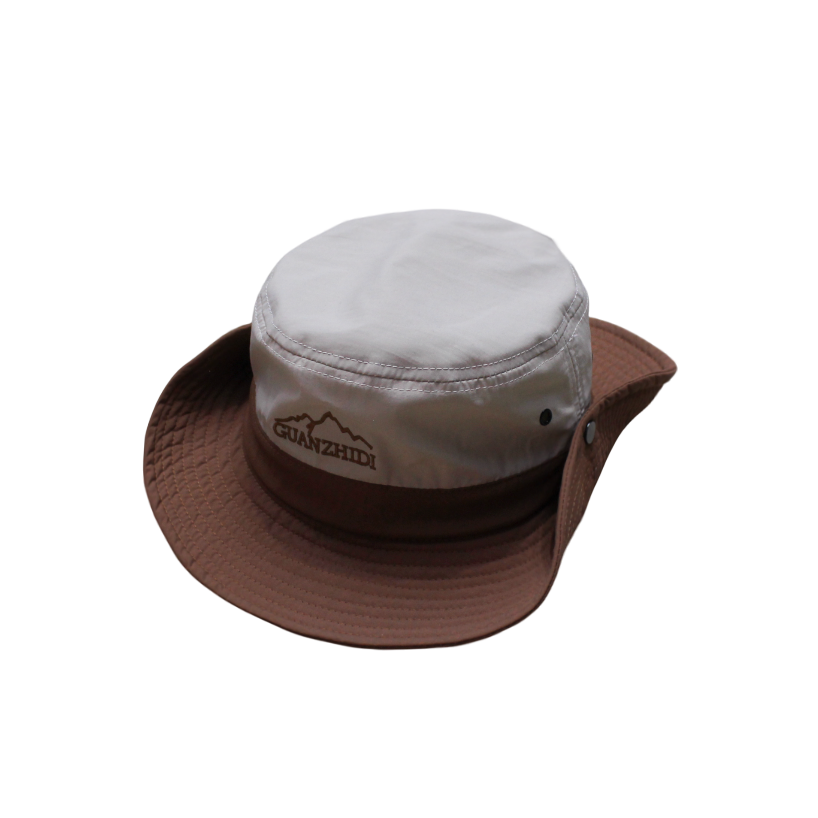 This is a color - blocked bucket hat, mainly featuring a combination of light beige and brown, with a fresh style and a touch of outdoor feel. There are the words "GUANZHIDI" and mountain patterns on the hat body, which add a sense of design and recognition. The wide brim can effectively shield from the sun, suitable for outdoor activities such as going out and fishing. At the same time, it can also be used as a fashion item for daily wear, easily matching casual clothes.