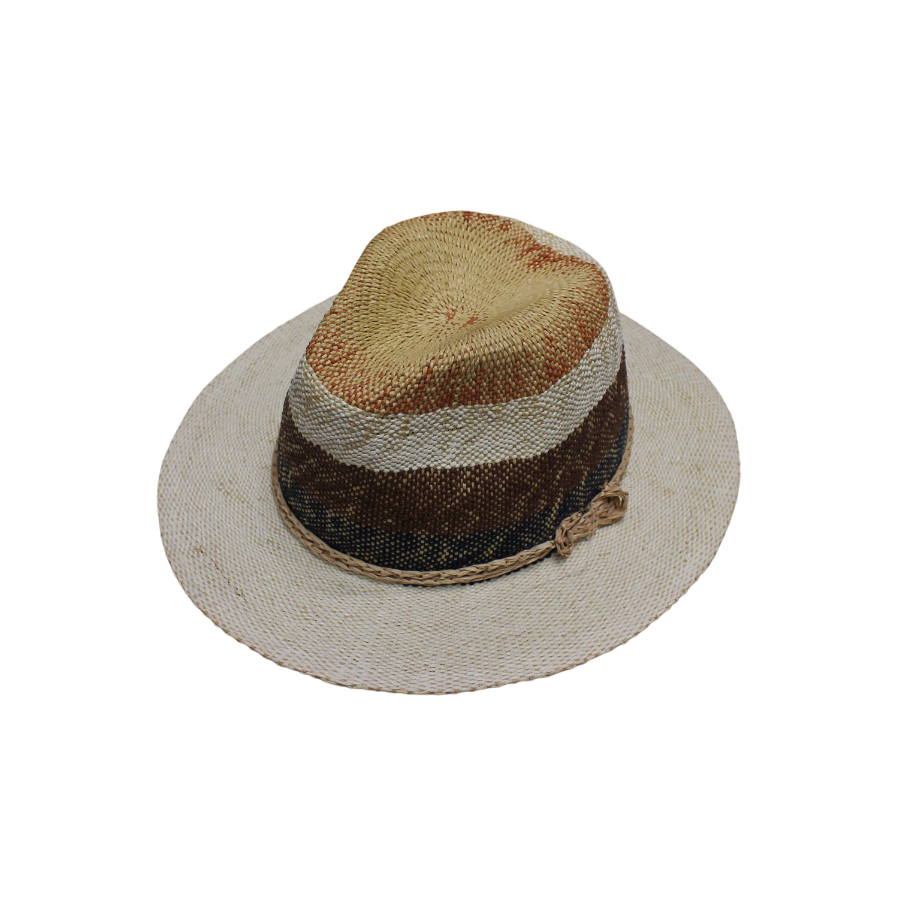 This is a straw fedora. Made of straw, the hat features a multi - color striped design with shades of brown, off - white, and dark brown, creating rich color layers and an artistic feel. The classic fedora shape is paired with a braided rope band (with a knot decoration), combining a casual and exquisite style. The breathable straw material is suitable for summer wear, adding a retro or vacation vibe to the outfit while providing sun protection and fashion sense.