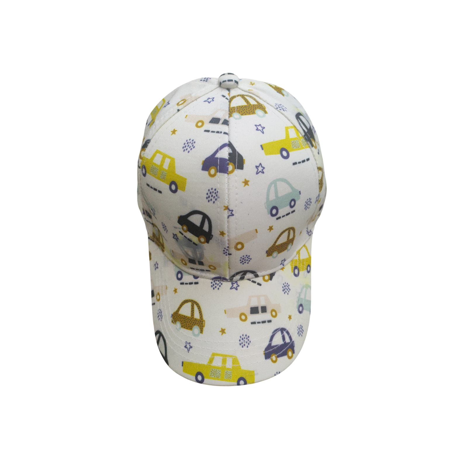 This is a children's baseball cap. It has a white base color and is covered with colorful cartoon car patterns in hues like yellow, purple, and black. Additionally, it’s dotted with stars and dot - like decorations, which makes it full of childlike fun. With a classic baseball cap style, the brim can shield children from the sun. It's perfect for kids to wear during daily outings or playtime, combining practicality with adorable charm.