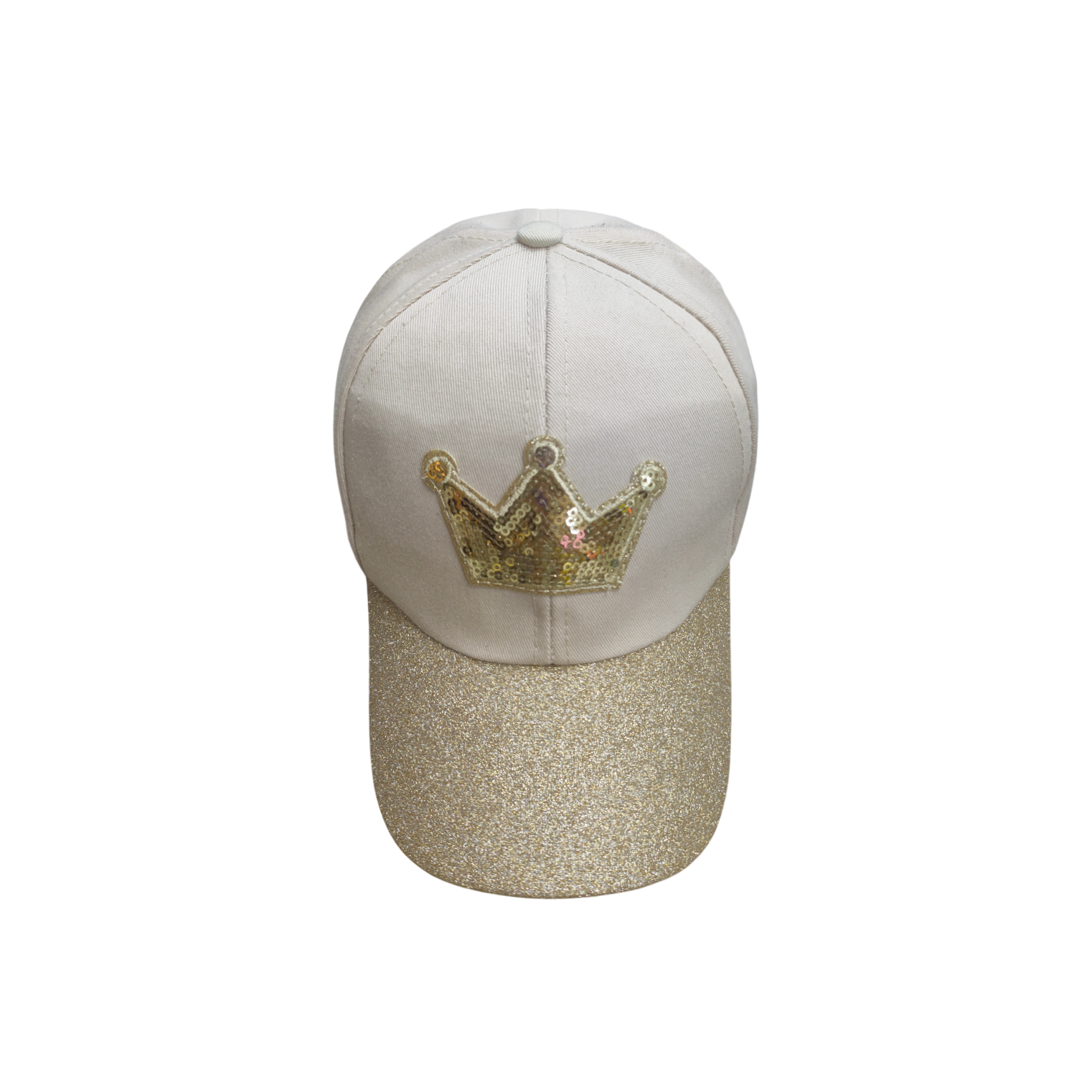 This is a children's baseball cap. The main part of the cap is light beige, while the brim features a glittery gold design that shimmers. There’s a gold sequin crown appliqué on the front, adding a touch of fairy - tale charm. With a classic baseball cap shape, it’s both practical for sun protection and stylishly cute, perfect for kids to wear in daily life or at fun events.