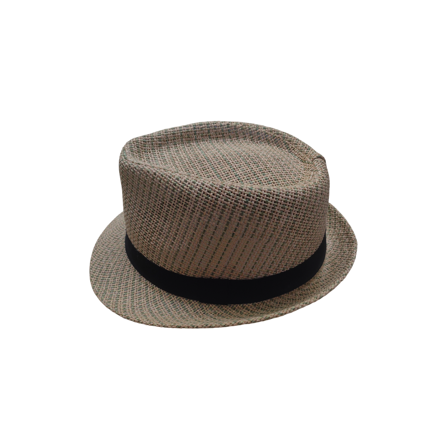This is a straw Trilby hat. Made of light brown mixed - weave straw, it has fine weaving textures and feels light and breathable. A black decorative band wraps around the hat, which is minimalist and neat. The brim is narrow with a slight upward curve. The overall shape is retro and exquisite, suitable for daily casual matching and also able to add an elegant retro style to the outfit.