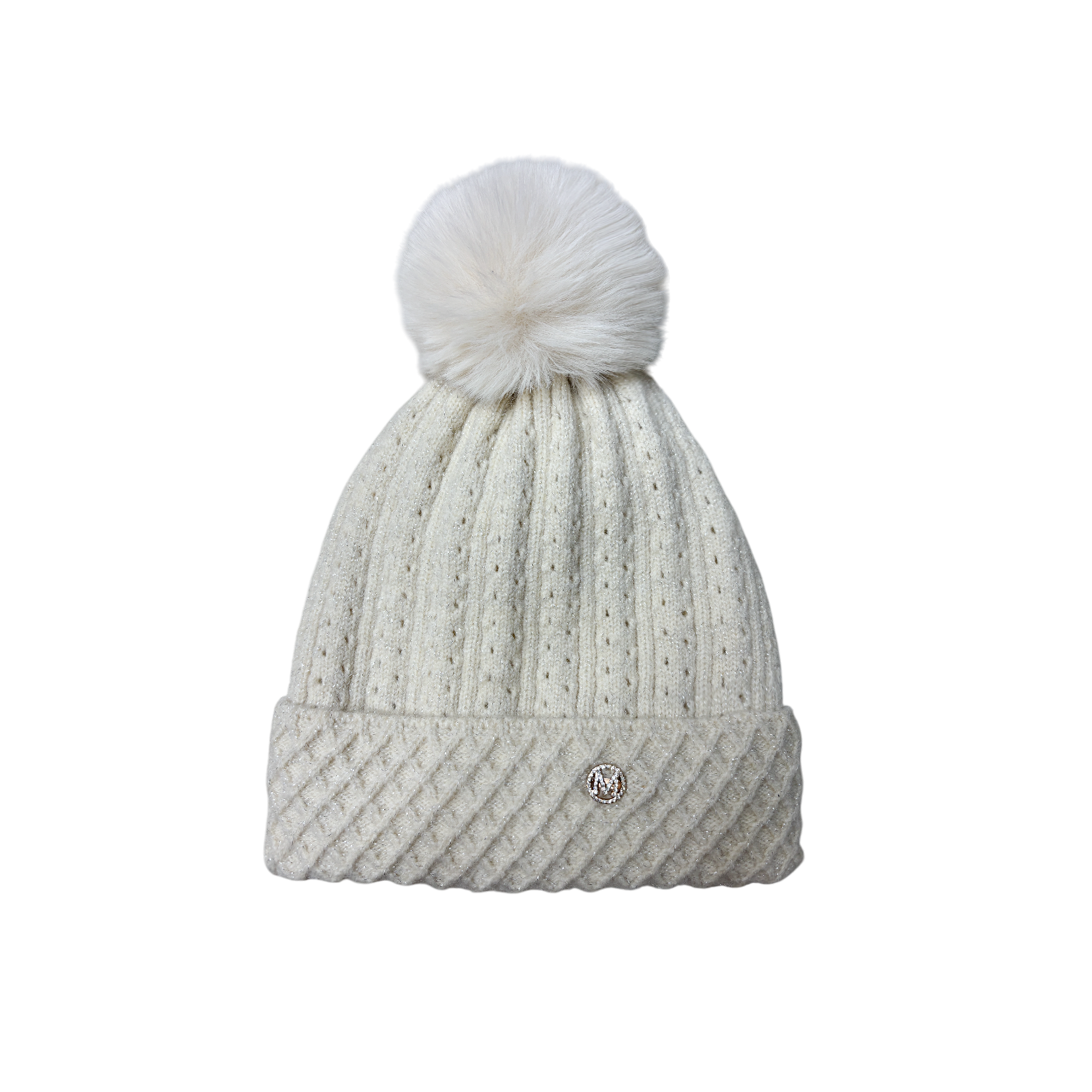 This is a one - size - fits - most knitted hat made of acrylic. It features a classic cuffed design. The main body is in a soft off - white tone, with a splicing knitting technique of hollow and rib patterns, being breathable and layered. A small rhinestone - adorned badge on the cuff serves as an exquisite embellishment. A matching - color fluffy pom - pom on the top adds a playful and warm atmosphere. The acrylic material provides good warmth, suitable for daily autumn - winter wear. Simple yet with delicate ingenuity, it easily enhances the outfit’s style.