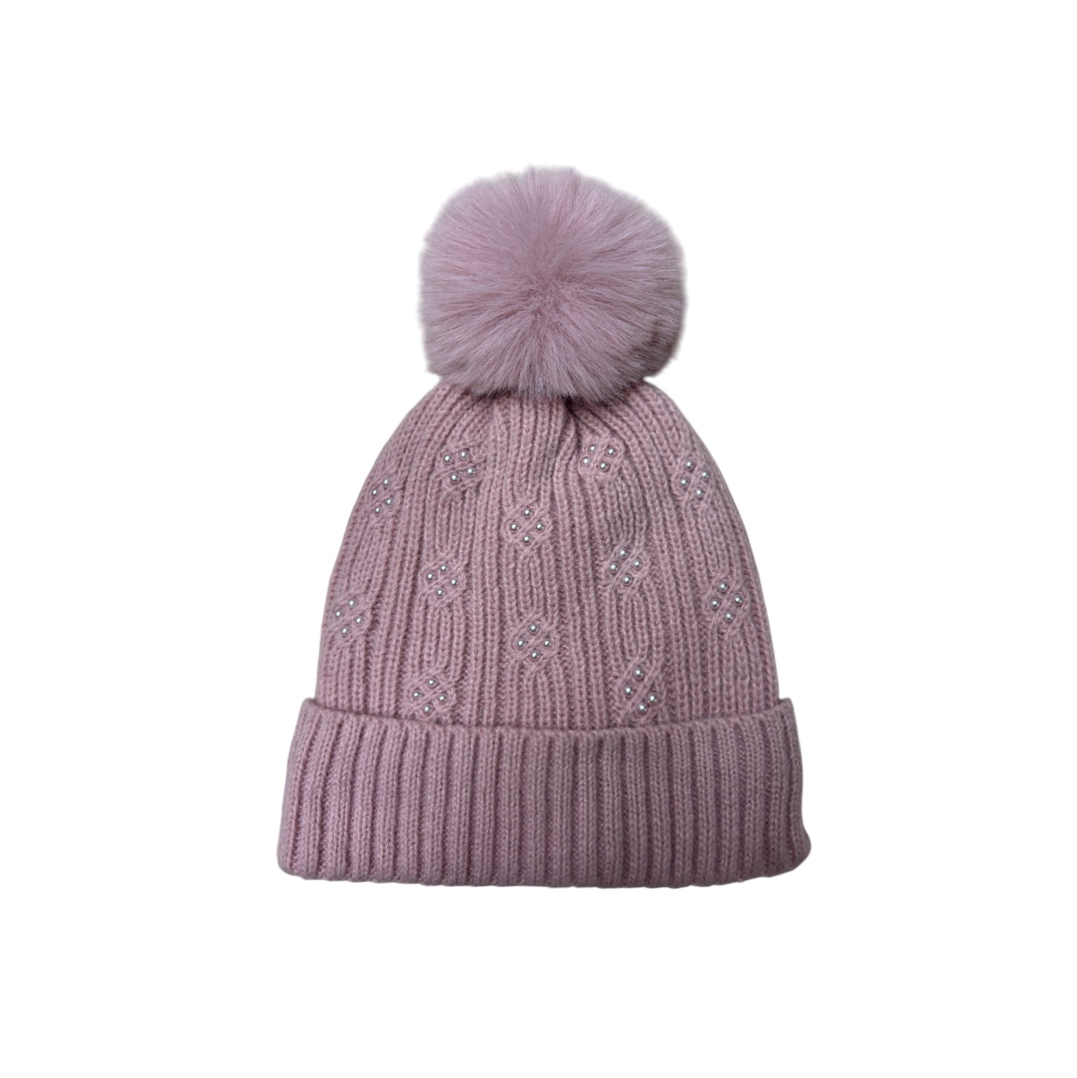 This is a one - size - fits - most knitted hat made of acrylic. It has a classic cuffed beanie shape. The main body is in a soft pink - purple color. The hat body uses a rib - knit technique and is decorated with multiple sets of diamond - like patterns, adding a sense of delicacy and luxury. A matching - color fluffy pom - pom on the top makes it sweet and playful. The acrylic material provides good warmth, suitable for daily autumn - winter wear, infusing a romantic and sweet atmosphere into the outfit, and easily creating an exquisite and fashionable style.
