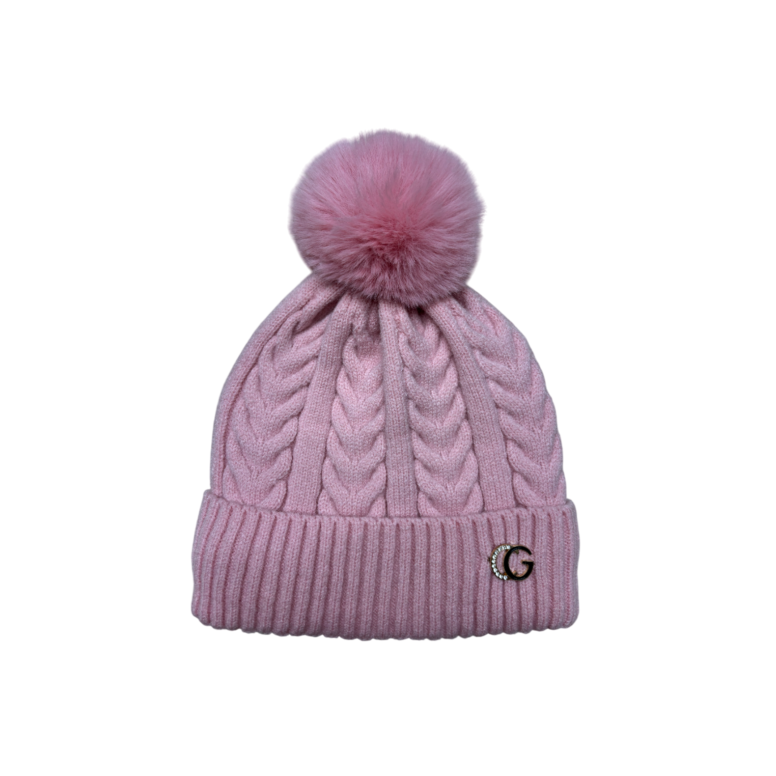 This is a one - size - fits - most knitted hat made of acrylic. It features a classic cuffed design. The main body is in soft pink, and the hat body uses a cable - knit technique to present three - dimensional textures with rich layers. A rhinestone - adorned letter “G” badge on the cuff is delicate and eye - catching. A matching - color fluffy pom - pom on the top adds a playful and warm atmosphere. The acrylic material provides good warmth, suitable for daily autumn - winter wear, infusing a sweet and exquisite style into the outfit.